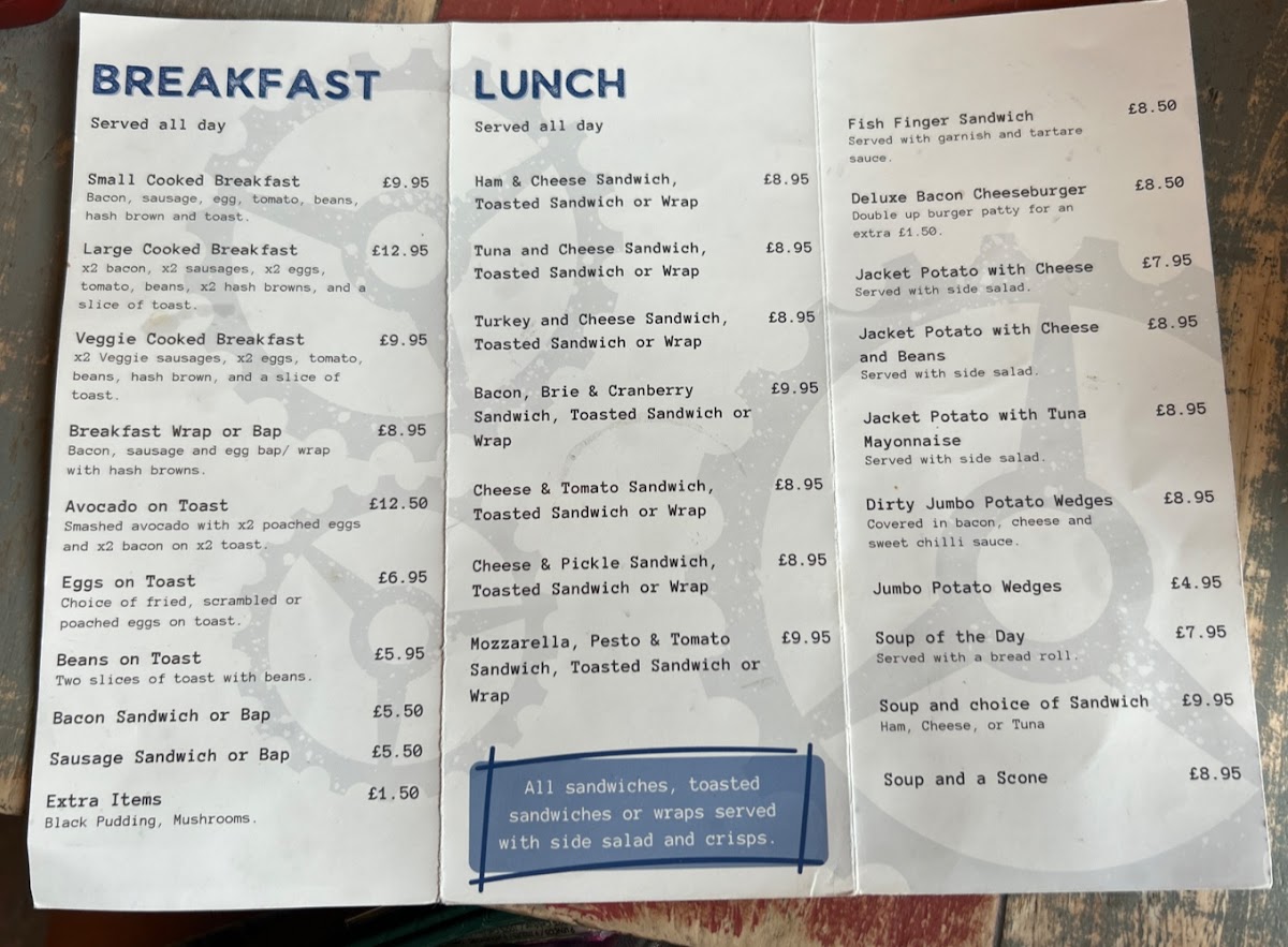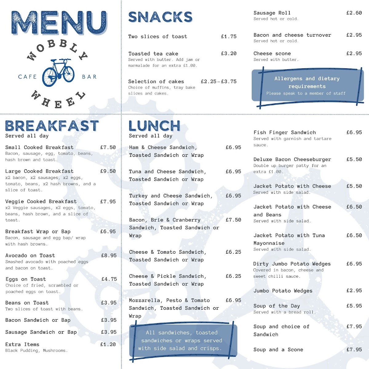 The menu at Wobbly Wheel Cafe is organized into several key sections catering to different meal times and preferences. For breakfast, the menu includes a variety of cooked options such as small and large cooked breakfasts, vegetarian choices, breakfast wraps or baps, and lighter items like avocado on toast, eggs on toast, and bacon or sausage sandwiches. These options provide a range of hearty and lighter morning meals.
